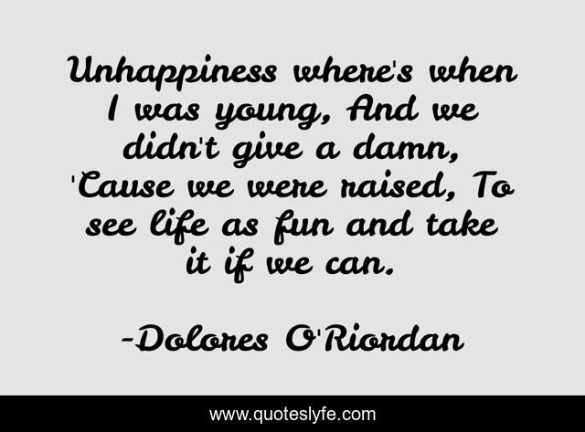 This page presents the quote "Unhappiness where's when I was young, And we didn't give a damn, 'Cause we were raised, To see life as fun and take it if we can.". Author of this quote is Dolores O'Riordan. This quote is about the-cranberries, music, lyrics,.