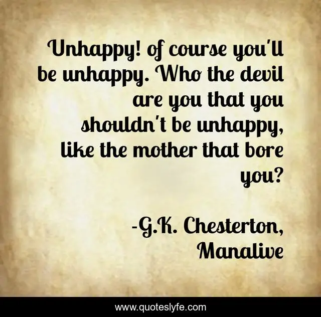 This page presents the quote "Unhappy! of course you'll be unhappy. Who the devil are you that you shouldn't be unhappy, like the mother that bore you?". Author of this quote is G.K. Chesterton, Manalive. This quote is about happiness, unhappiness,.