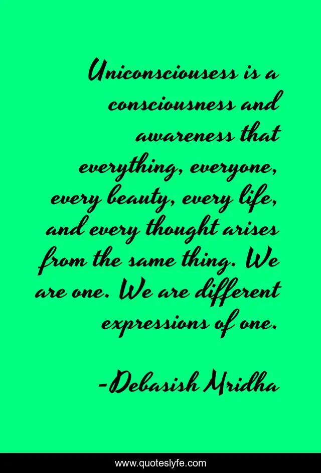 This page presents the quote "Uniconsciousess is a consciousness and awareness that everything, everyone, every beauty, every life, and every thought arises from the same thing. We are one. We are different expressions of one.". Author of this quote is Debasish Mridha. This quote is about miraboli, life, beauty, oscar-wilde, philosophy, debasish-mridha, tagore, we-are-one, quotes,.