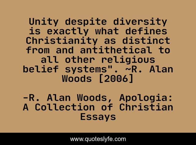 This page presents the quote "Unity despite diversity is exactly what defines Christianity as distinct from and antithetical to all other religious belief systems". ~R. Alan Woods [2006]". Author of this quote is R. Alan Woods, Apologia: A Collection of Christian Essays. This quote is about diversity, unity-in-the-church, r-alan-woods,.