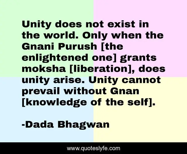 This page presents the quote "Unity does not exist in the world. Only when the Gnani Purush [the enlightened one] grants moksha [liberation], does unity arise. Unity cannot prevail without Gnan [knowledge of the self].". Author of this quote is Dada Bhagwan. This quote is about spiritual, knowledge, liberation, gnani-purush, enlightened, gnan, moksha,.
