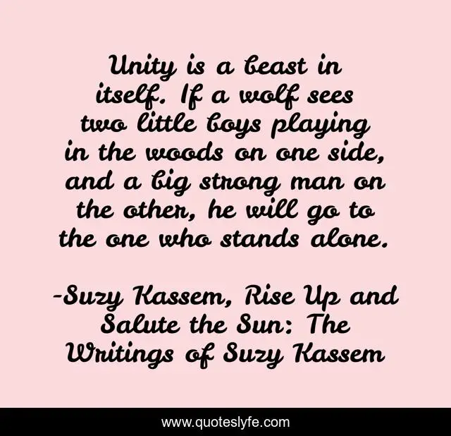 This page presents the quote "Unity is a beast in itself. If a wolf sees two little boys playing in the woods on one side, and a big strong man on the other, he will go to the one who stands alone.". Author of this quote is Suzy Kassem, Rise Up and Salute the Sun: The Writings of Suzy Kassem. This quote is about beast, unity, strength, suzy-kassem,.