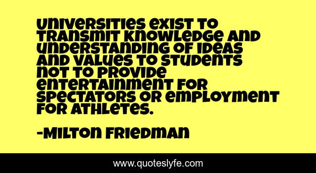 This page presents the quote "Universities exist to transmit knowledge and understanding of ideas and values to students not to provide entertainment for spectators or employment for athletes.". Author of this quote is Milton Friedman. This quote is about values, ideas, understanding,.