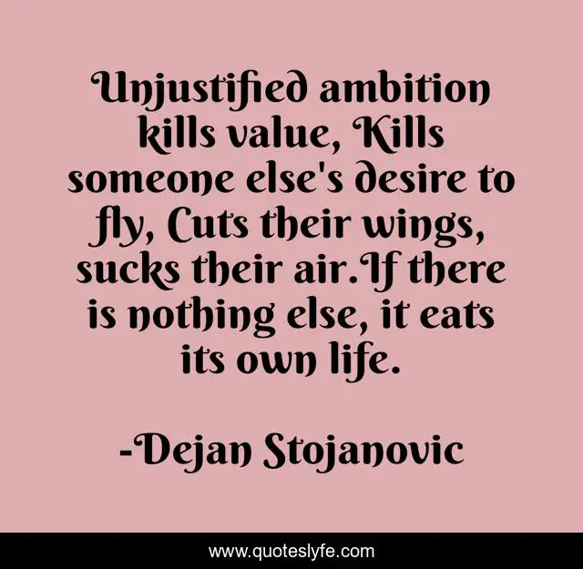This page presents the quote "Unjustified ambition kills value, Kills someone else's desire to fly, Cuts their wings, sucks their air.If there is nothing else, it eats its own life.". Author of this quote is Dejan Stojanovic. This quote is about desire, fly, life, literature, dejan-stojanovic, poetry, air, quotes, ambition,.