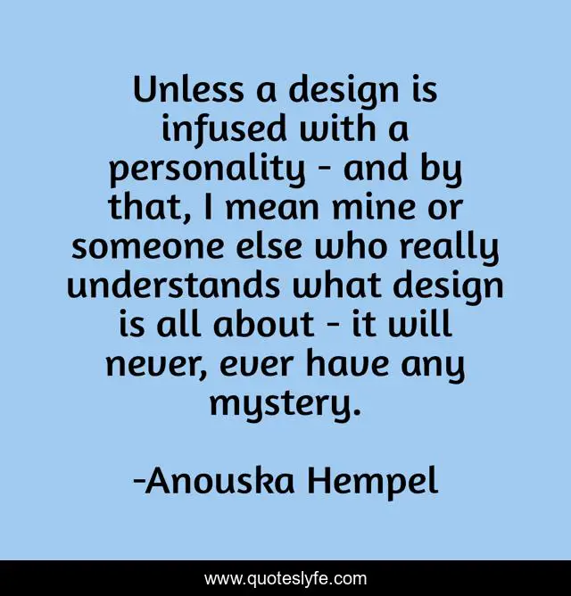 This page presents the quote "Unless a design is infused with a personality - and by that, I mean mine or someone else who really understands what design is all about - it will never, ever have any mystery.". Author of this quote is Anouska Hempel. This quote is about mystery, personality, mean,.