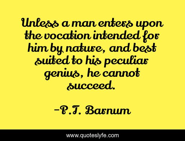 This page presents the quote "Unless a man enters upon the vocation intended for him by nature, and best suited to his peculiar genius, he cannot succeed.". Author of this quote is P.T. Barnum. .