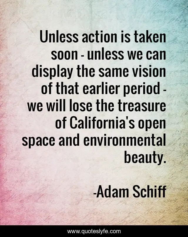 This page presents the quote "Unless action is taken soon - unless we can display the same vision of that earlier period - we will lose the treasure of California's open space and environmental beauty.". Author of this quote is Adam Schiff. This quote is about beauty, vision, space,.