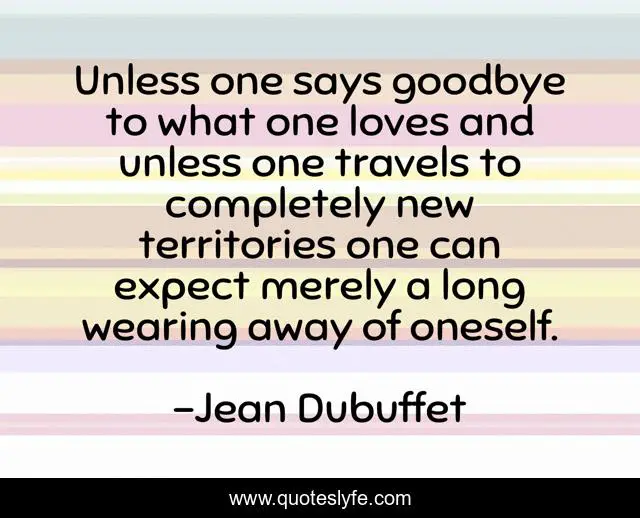 This page presents the quote "Unless one says goodbye to what one loves and unless one travels to completely new territories one can expect merely a long wearing away of oneself.". Author of this quote is Jean Dubuffet. This quote is about courage, bravery,.