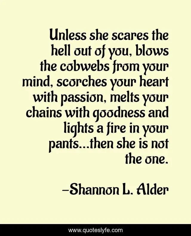This page presents the quote "Unless she scares the hell out of you, blows the cobwebs from your mind, scorches your heart with passion, melts your chains with goodness and lights a fire in your pants...then she is not the one.". Author of this quote is Shannon L. Alder. This quote is about knowing-vs-guessing, relatinships-101, relationship, prayers, fiance, the-one, clarity, seeking, discernment,.