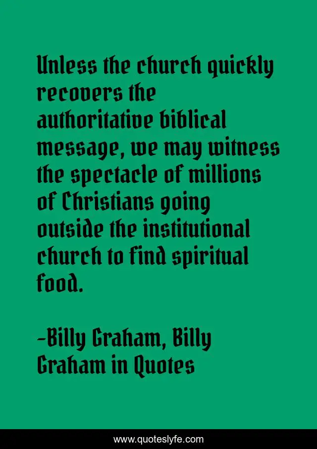 This page presents the quote "Unless the church quickly recovers the authoritative biblical message, we may witness the spectacle of millions of Christians going outside the institutional church to find spiritual food.". Author of this quote is Billy Graham, Billy Graham in Quotes. This quote is about billy-graham, church,.