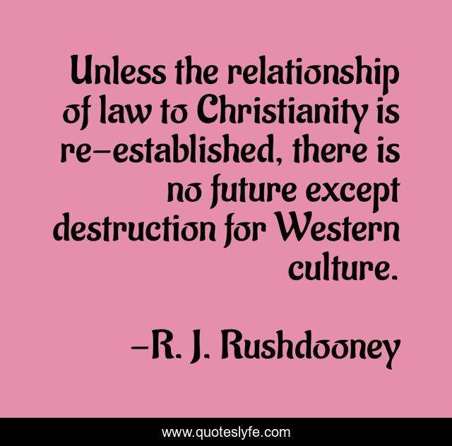 This page presents the quote "Unless the relationship of law to Christianity is re-established, there is no future except destruction for Western culture.". Author of this quote is R. J. Rushdooney. This quote is about culture, law, politics,.