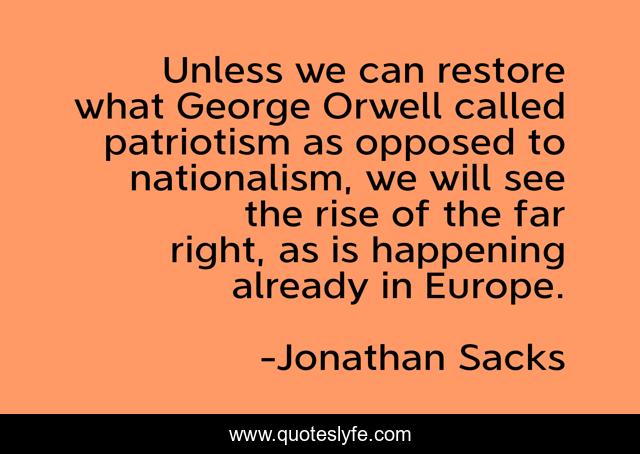 This page presents the quote "Unless we can restore what George Orwell called patriotism as opposed to nationalism, we will see the rise of the far right, as is happening already in Europe.". Author of this quote is Jonathan Sacks. This quote is about patriot, patriotism, alt-right, far-right, patriotic, nationalism,.