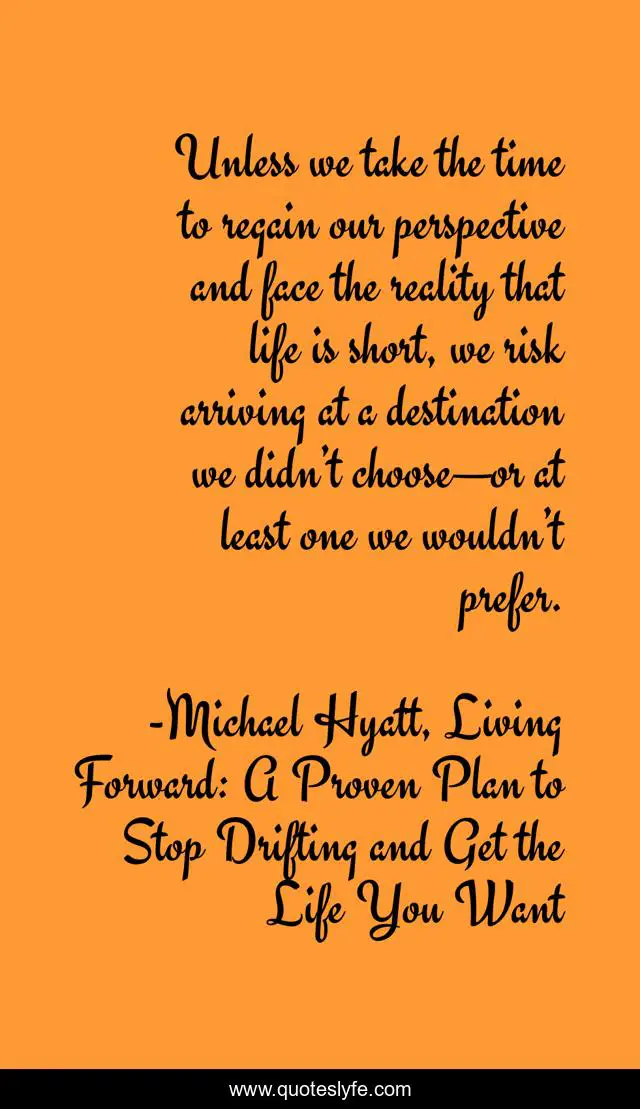 This page presents the quote "Unless we take the time to regain our perspective and face the reality that life is short, we risk arriving at a destination we didn’t choose—or at least one we wouldn’t prefer.". Author of this quote is Michael Hyatt, Living Forward: A Proven Plan to Stop Drifting and Get the Life You Want. This quote is about life-plan, destination, reality, perspective, personal-development, intentional-living,.