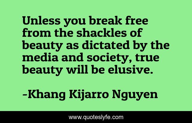 This page presents the quote "Unless you break free from the shackles of beauty as dictated by the media and society, true beauty will be elusive.". Author of this quote is Khang Kijarro Nguyen. This quote is about media, beauty, independence, true-beauty,.