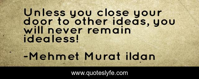 This page presents the quote "Unless you close your door to other ideas, you will never remain idealess!". Author of this quote is Mehmet Murat ildan. This quote is about idealess, mehmet-murat-ildan, ildan-wise-sayings, turkish, ildan-wisdom, turkish-playwrights, idea, ideas, turkish-wisdom-words,.