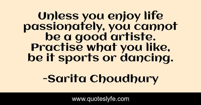 This page presents the quote "Unless you enjoy life passionately, you cannot be a good artiste. Practise what you like, be it sports or dancing.". Author of this quote is Sarita Choudhury. This quote is about life, good, enjoy life,.