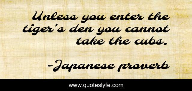 This page presents the quote "Unless you enter the tiger's den you cannot take the cubs.". Author of this quote is Japanese proverb. .