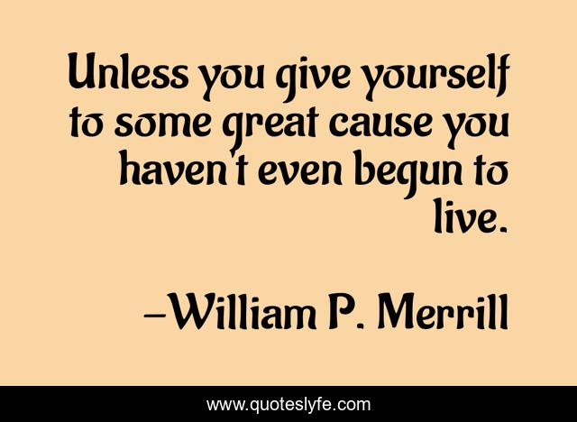 This page presents the quote "Unless you give yourself to some great cause you haven't even begun to live.". Author of this quote is William P. Merrill. .