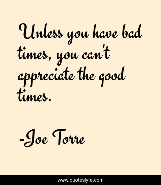 This page presents the quote "Unless you have bad times, you can't appreciate the good times.". Author of this quote is Joe Torre. This quote is about appreciate, good times,.