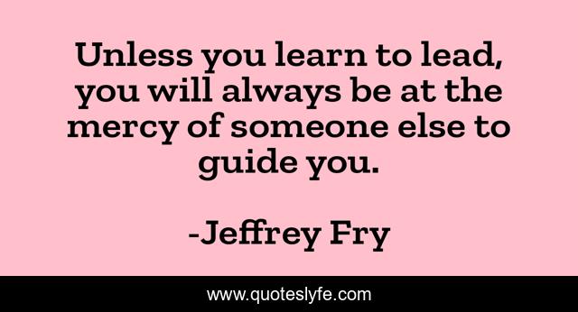 This page presents the quote "Unless you learn to lead, you will always be at the mercy of someone else to guide you.". Author of this quote is Jeffrey Fry. This quote is about mercy, unless, lead, always, someone-else, learn, guide,.