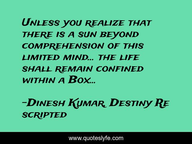 This page presents the quote "Unless you realize that there is a sun beyond comprehension of this limited mind... the life shall remain confined within a Box...". Author of this quote is Dinesh Kumar, Destiny Re scripted. This quote is about life, will-power, success, objectives, goals, free-will, change-destiny,.