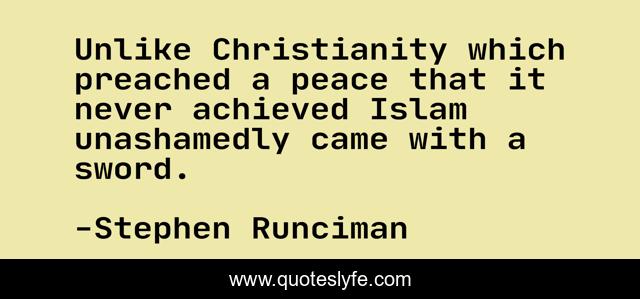 This page presents the quote "Unlike Christianity which preached a peace that it never achieved Islam unashamedly came with a sword.". Author of this quote is Stephen Runciman. This quote is about christians, christianity,.