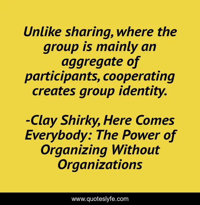 This page presents the quote "Unlike sharing, where the group is mainly an aggregate of participants, cooperating creates group identity.". Author of this quote is Clay Shirky, Here Comes Everybody: The Power of Organizing Without Organizations. This quote is about society, organization, communication,.