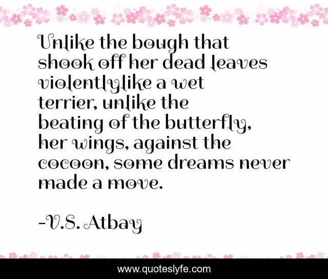This page presents the quote "Unlike the bough that shook off her dead leaves violentlylike a wet terrier, unlike the beating of the butterfly, her wings, against the cocoon, some dreams never made a move.". Author of this quote is V.S. Atbay. .