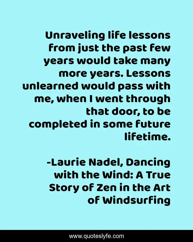 This page presents the quote "Unraveling life lessons from just the past few years would take many more years. Lessons unlearned would pass with me, when I went through that door, to be completed in some future lifetime.". Author of this quote is Laurie Nadel, Dancing with the Wind: A True Story of Zen in the Art of Windsurfing. This quote is about life, inspirational, quote-of-the-day, dan-rather, wayne-dyer, life-lessons, quote-about-life, enthusiasm, quotes-twitter,.