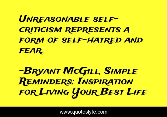 This page presents the quote "Unreasonable self-criticism represents a form of self-hatred and fear.". Author of this quote is Bryant McGill, Simple Reminders: Inspiration for Living Your Best Life. This quote is about criticism, self-hatred, fear,.