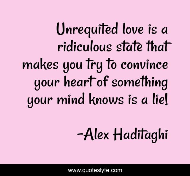 This page presents the quote "Unrequited love is a ridiculous state that makes you try to convince your heart of something your mind knows is a lie!". Author of this quote is Alex Haditaghi. This quote is about heart, lovers, love, heart-break, heartbreak, love-hurts, heartbroken, affection,.