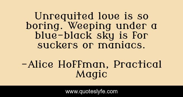 This page presents the quote "Unrequited love is so boring. Weeping under a blue-black sky is for suckers or maniacs.". Author of this quote is Alice Hoffman, Practical Magic. This quote is about romance, humor, unrequited-love,.