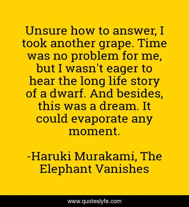 This page presents the quote "Unsure how to answer, I took another grape. Time was no problem for me, but I wasn't eager to hear the long life story of a dwarf. And besides, this was a dream. It could evaporate any moment.". Author of this quote is Haruki Murakami, The Elephant Vanishes. This quote is about alternative-dimension, dream, dwarf, viewpoint,.