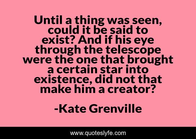 This page presents the quote "Until a thing was seen, could it be said to exist? And if his eye through the telescope were the one that brought a certain star into existence, did not that make him a creator?". Author of this quote is Kate Grenville. This quote is about daniel-rooke, creator, science, kate-grenvile, stars, the-lieutenant, astronomy,.