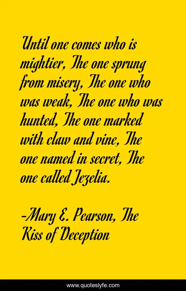 This page presents the quote "Until one comes who is mightier, The one sprung from misery, The one who was weak, The one who was hunted, The one marked with claw and vine, The one named in secret, The one called Jezelia.". Author of this quote is Mary E. Pearson, The Kiss of Deception. This quote is about inspiartional, claws, prophecy, courage, strength,.