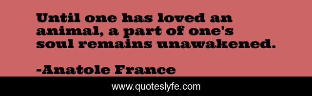 This page presents the quote "Until one has loved an animal, a part of one's soul remains unawakened.". Author of this quote is Anatole France. This quote is about animals, love, pets, affection,.