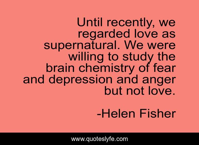 This page presents the quote "Until recently, we regarded love as supernatural. We were willing to study the brain chemistry of fear and depression and anger but not love.". Author of this quote is Helen Fisher. This quote is about fear, love, depression, affection,.