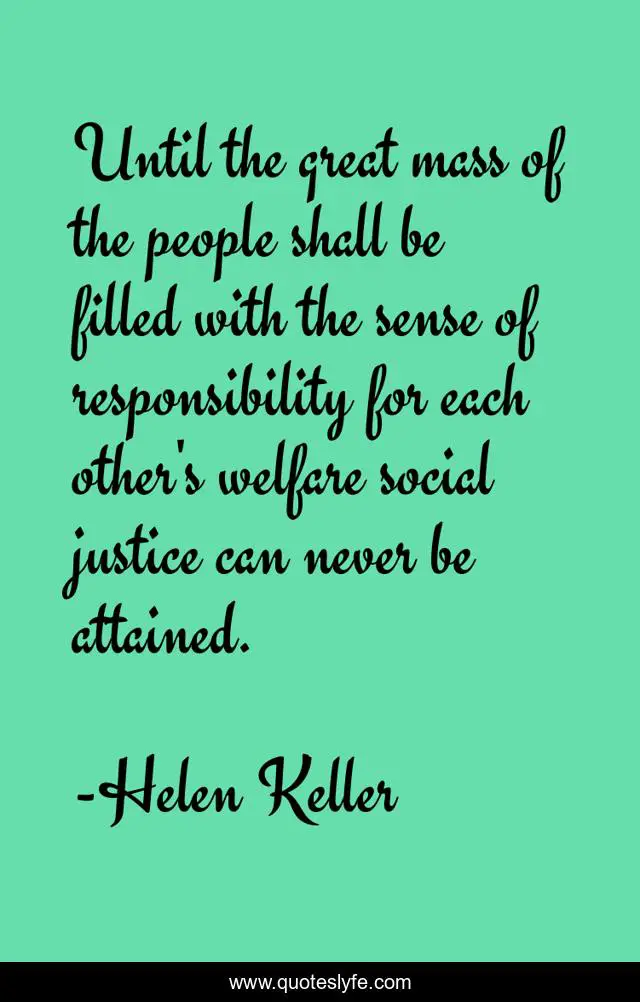 This page presents the quote "Until the great mass of the people shall be filled with the sense of responsibility for each other's welfare social justice can never be attained.". Author of this quote is Helen Keller. This quote is about helping, people,.