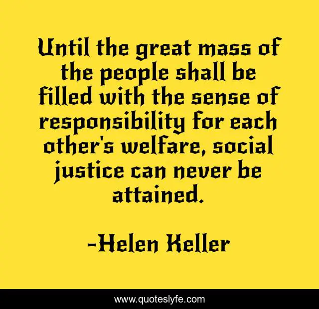 This page presents the quote "Until the great mass of the people shall be filled with the sense of responsibility for each other's welfare, social justice can never be attained.". Author of this quote is Helen Keller. This quote is about justice, responsibility,.