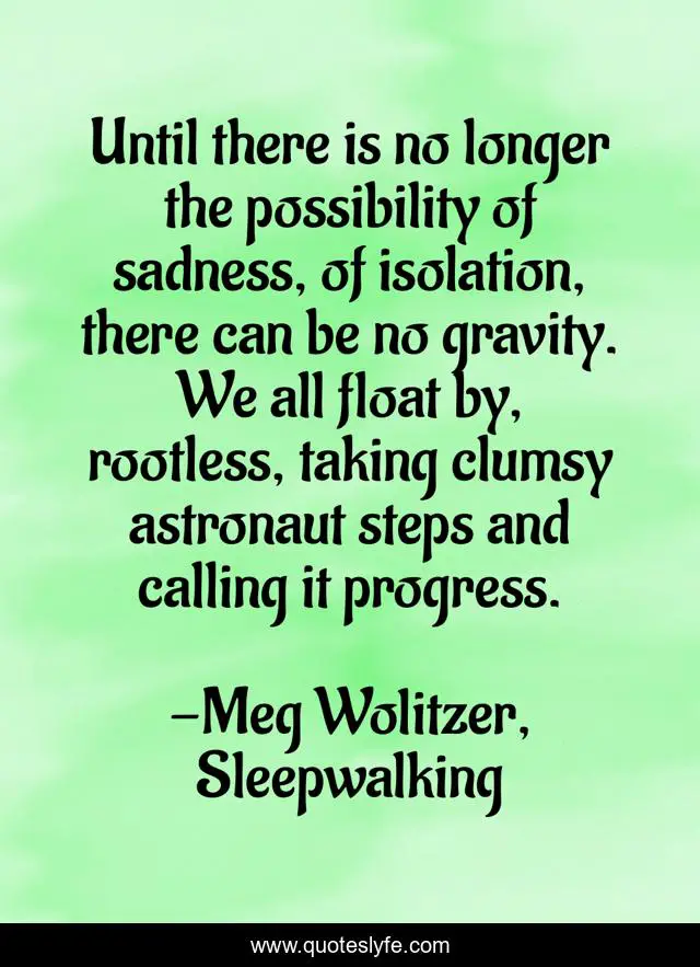 This page presents the quote "Until there is no longer the possibility of sadness, of isolation, there can be no gravity. We all float by, rootless, taking clumsy astronaut steps and calling it progress.". Author of this quote is Meg Wolitzer, Sleepwalking. This quote is about loneliness, sadness,.