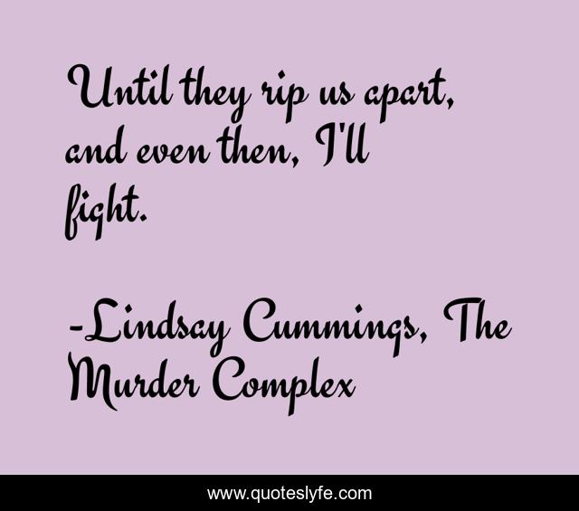 This page presents the quote "Until they rip us apart, and even then, I'll fight.". Author of this quote is Lindsay Cummings, The Murder Complex. This quote is about survival, love, affection,.