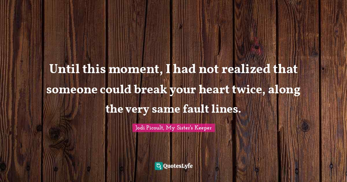 This page presents the quote "Until this moment, I had not realized that someone could break your heart twice, along the very same fault lines.". Author of this quote is Jodi Picoult, My Sister's Keeper. This quote is about broken-heart, love, bhie, my-sister-s-keeper, jodi-picoult, affection,.