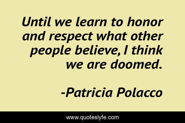 This page presents the quote "Until we learn to honor and respect what other people believe, I think we are doomed.". Author of this quote is Patricia Polacco. This quote is about believe, honor, people,.