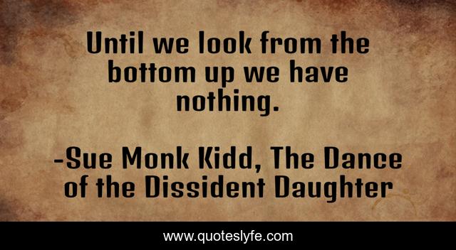 This page presents the quote "Until we look from the bottom up we have nothing.". Author of this quote is Sue Monk Kidd, The Dance of the Dissident Daughter. This quote is about spiritual-growth, transformation-spirituality, women,.