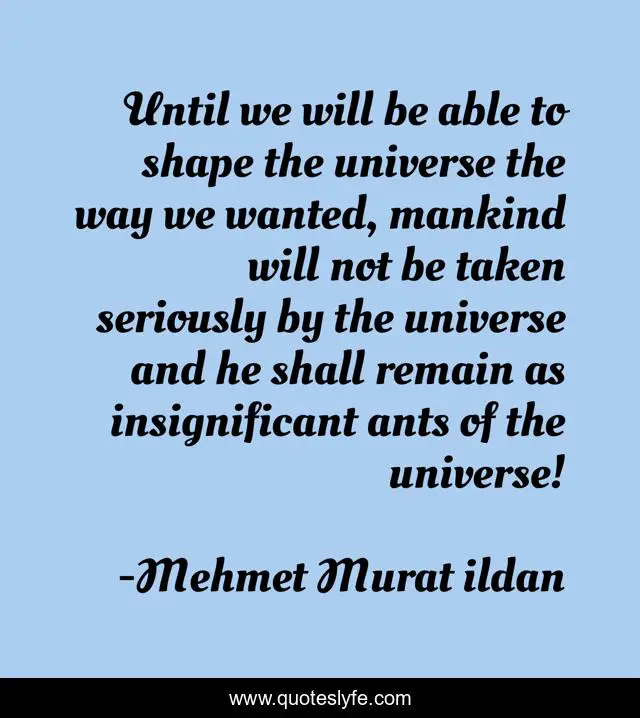 This page presents the quote "Until we will be able to shape the universe the way we wanted, mankind will not be taken seriously by the universe and he shall remain as insignificant ants of the universe!". Author of this quote is Mehmet Murat ildan. .