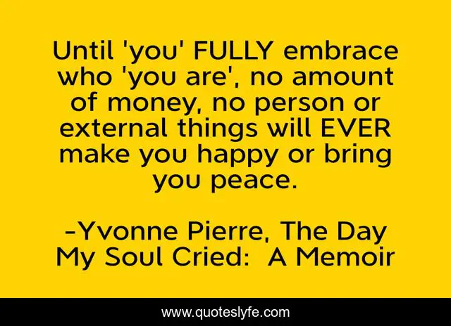This page presents the quote "Until 'you' FULLY embrace who 'you are', no amount of money, no person or external things will EVER make you happy or bring you peace.". Author of this quote is Yvonne Pierre, The Day My Soul Cried: A Memoir. This quote is about love, joy, peace, internal-peace, love-yourself, peace-of-mind, happiness, affection, happy,.