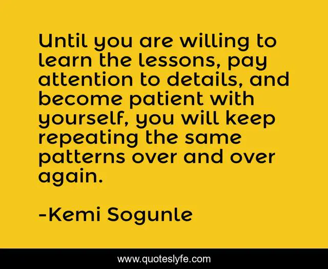 This page presents the quote "Until you are willing to learn the lessons, pay attention to details, and become patient with yourself, you will keep repeating the same patterns over and over again.". Author of this quote is Kemi Sogunle. This quote is about lessons, life, excuses, reality-of-life, pattern-of-behavior, patience, patterns, truth, action,.