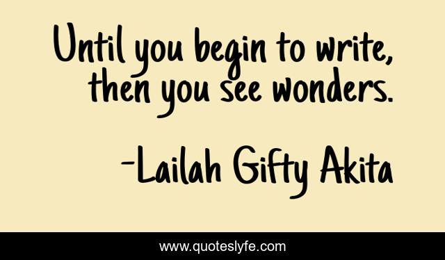 This page presents the quote "Until you begin to write, then you see wonders.". Author of this quote is Lailah Gifty Akita. This quote is about enthusiasm, spiritual, writing-life, inspirational, wonders,.