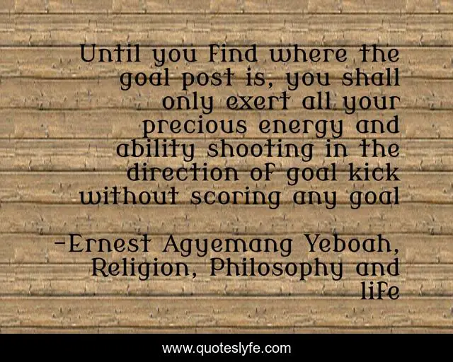 This page presents the quote "Until you find where the goal post is, you shall only exert all your precious energy and ability shooting in the direction of goal kick without scoring any goal". Author of this quote is Ernest Agyemang Yeboah, Religion, Philosophy and life. This quote is about indelible-footprints, things-that-matter-in-life, important-things-in-life, wasting-resources, time-wasting, wise-words, unplanned-life, soccer,.