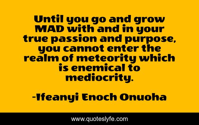 This page presents the quote "Until you go and grow MAD with and in your true passion and purpose, you cannot enter the realm of meteority which is enemical to mediocrity.". Author of this quote is Ifeanyi Enoch Onuoha. This quote is about life, talent, hinovelty, inspiration, making-a-difference, quote, motivation, ifeanyi-enoch-onuoha, passion,.